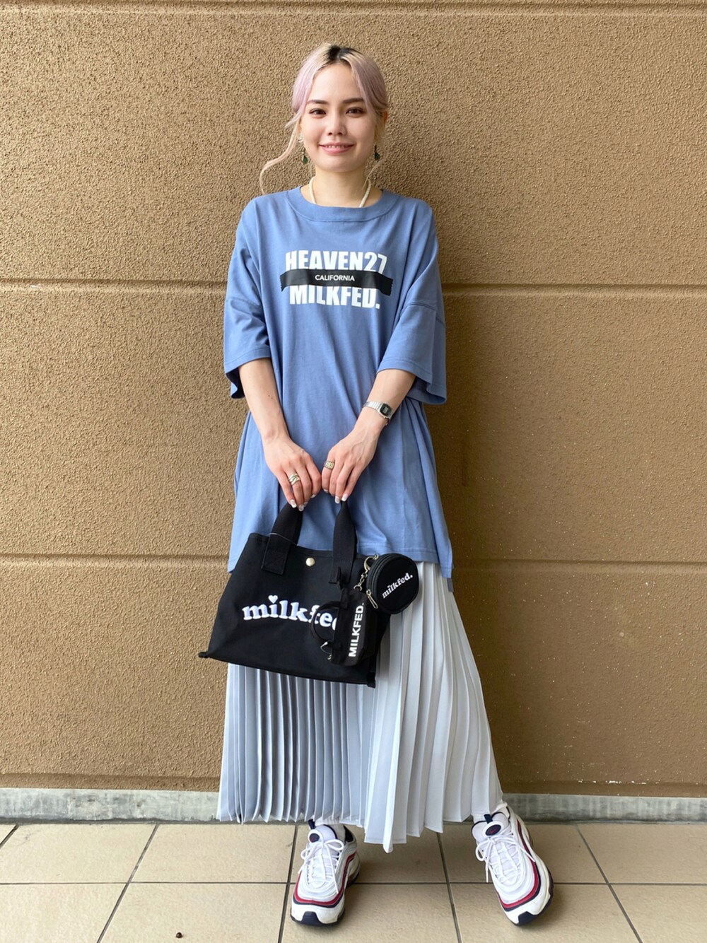 身長157cm 普段着用サイズS・M 【トップス】ワンサイズ 前は大きめロゴで、後ろはデザインは無くシンプルデザイン。またカラーもくすみブルーで落ち着いたデザインです! 【スカート】ワンサイズ 光沢のあるプリーツスカート。ウエストゴムなので着やすいデザイン。 トップスはゆるったしたものや インしてベルトを締めてもオシャレに決まります。 【バッグ】レッド・ホワイト・ブラック 人気シリーズのパイピングバッグのバージョンアップ!ロゴが刺繍になり形をハンドバッグの大きさと同じになっているので容量たっぷり入る大きさです。 【Instagram】@yurichan_4 インスタではお店の情報などや他のコーデを ストーリーや投稿などにアップしています! 通信販売も承っています!^ ^ お気軽にDM/もしくは店舗電話番号へご連絡下さい❤︎