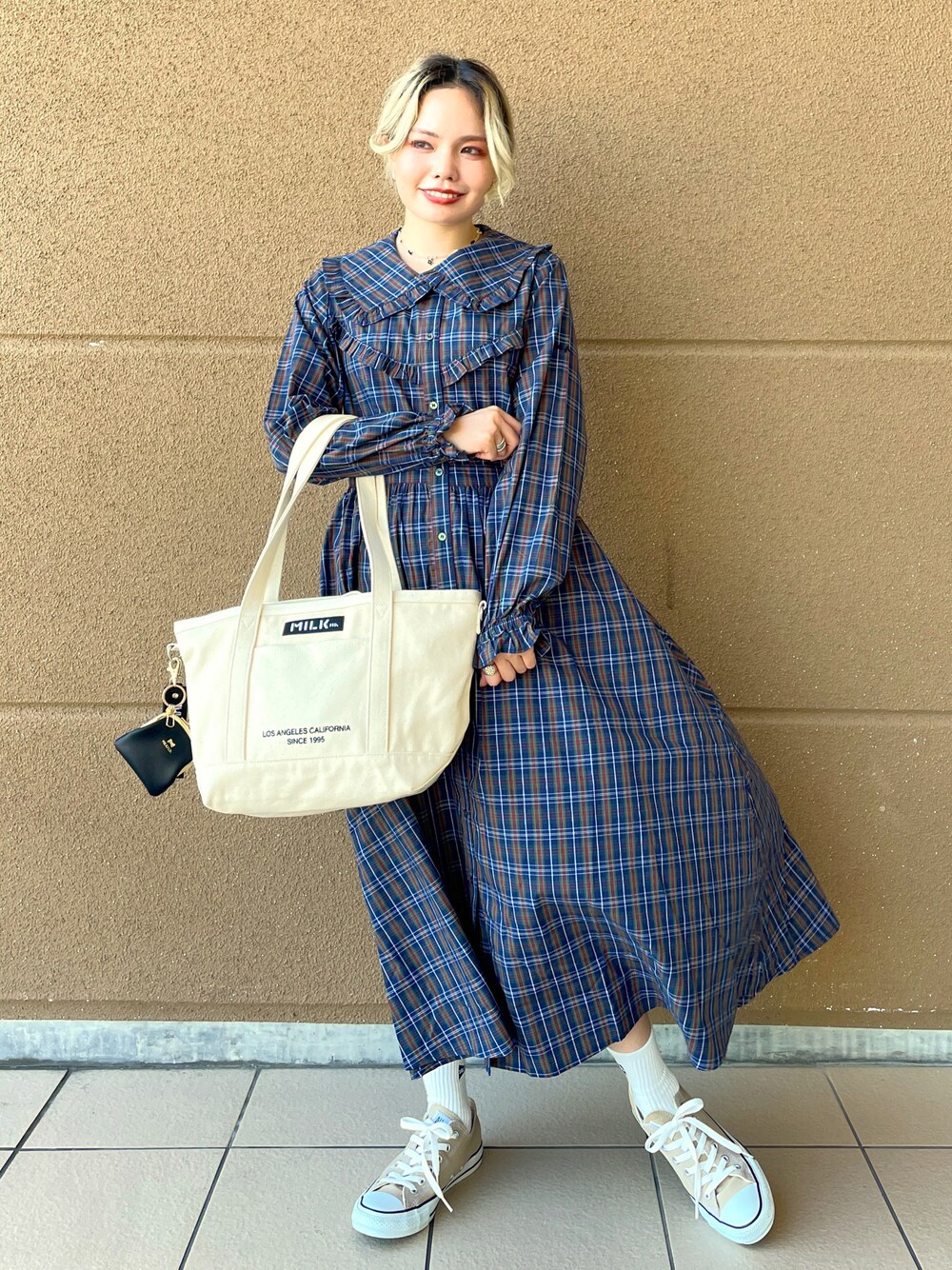 yurichan_4のショルダーバッグ「EMBROIDERED BAR 2WAY TOTE BAG/ロゴ トートバッグ/ショルダーバッグ/A4収納」を使ったコーディネート