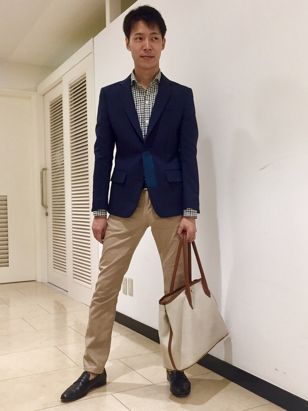 今日は取引先と商談、スマートカジュアルで! オーソドックスな組み合わせも素材を変えたり、ディティールを変えるとお洒落っぽく見えます😄