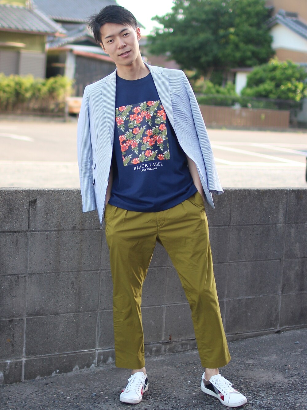 太めのパンツと合わせてリラックスしたいジャケットスタイル✨ ブルー×カーキの組み合わせは爽やかで男らしくお気に入りです😄 スニーカーは色違いで持っていて損しないアイテム!