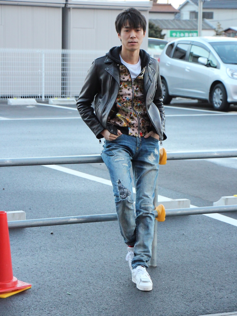 春はレザーを着たい第三弾! パーカーやウォッシュデニムと合わせてラフなスタイル。 バックパックなんかを持つとより今っぽいですね!