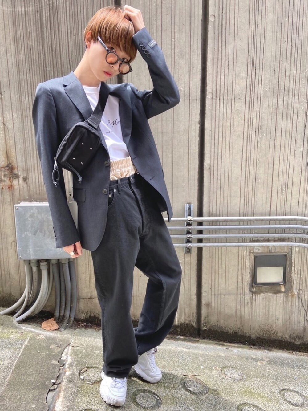 モノトーンを使い統一感を出しています! デニムパンツの中にベージュの ショートパンツを着用しており、 遊び心を加えました!!
