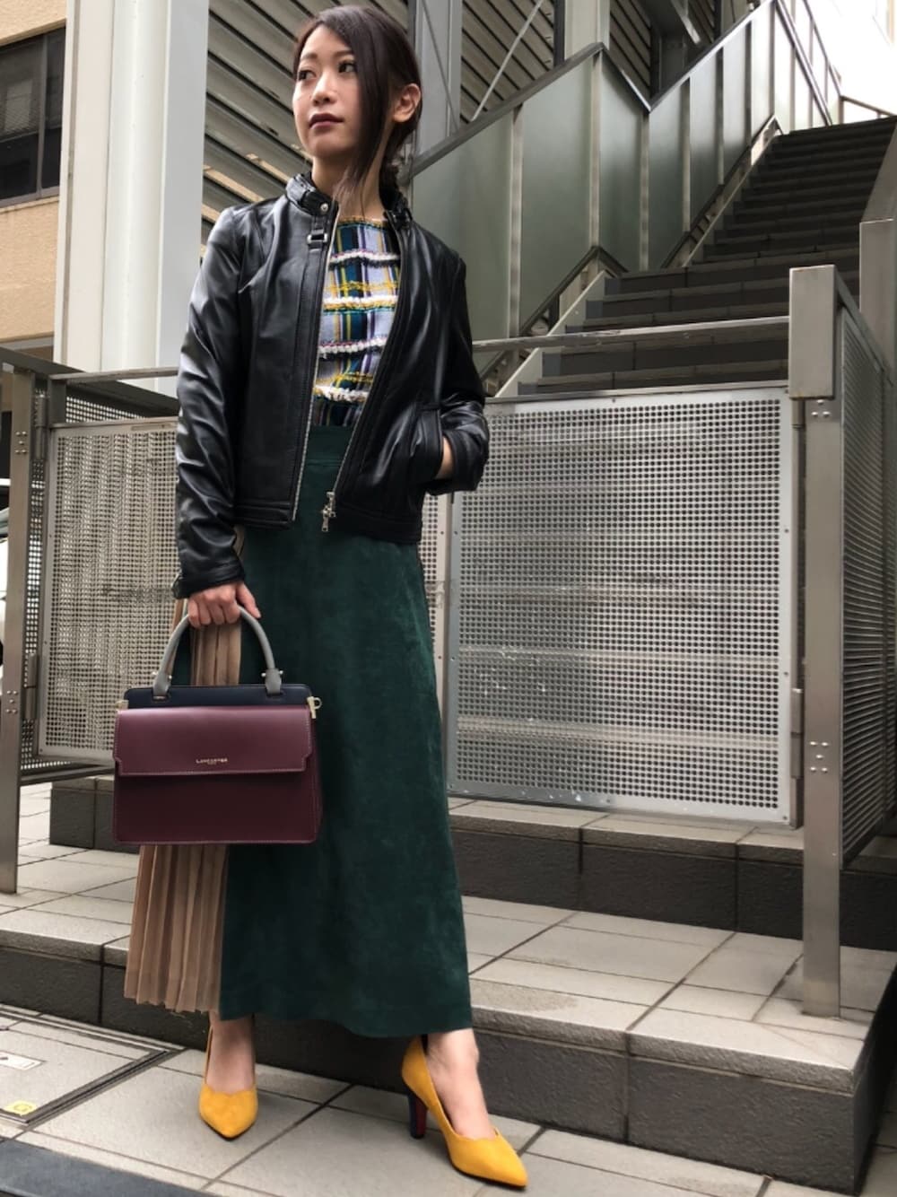 深みのあるグリーンのスカートとボルドーのバックで秋らしく!