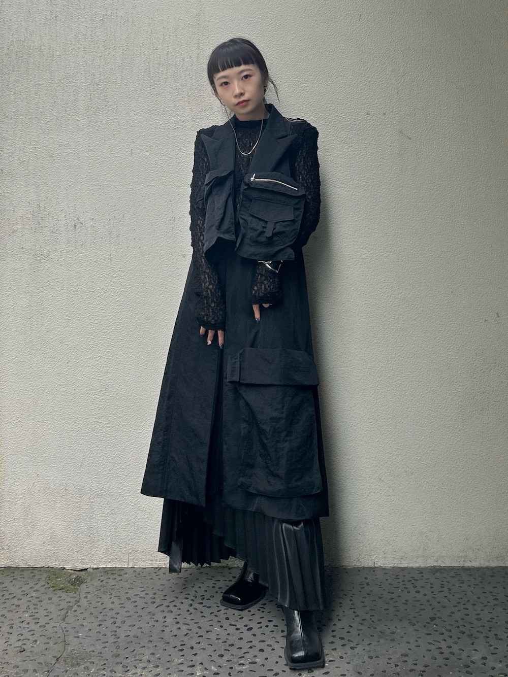 オールブラックなモードコーデ! akikoaokiのベスト、カバンの代わりくらい収納あって何とでも合います。背中部分もとっても可愛い!