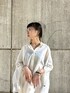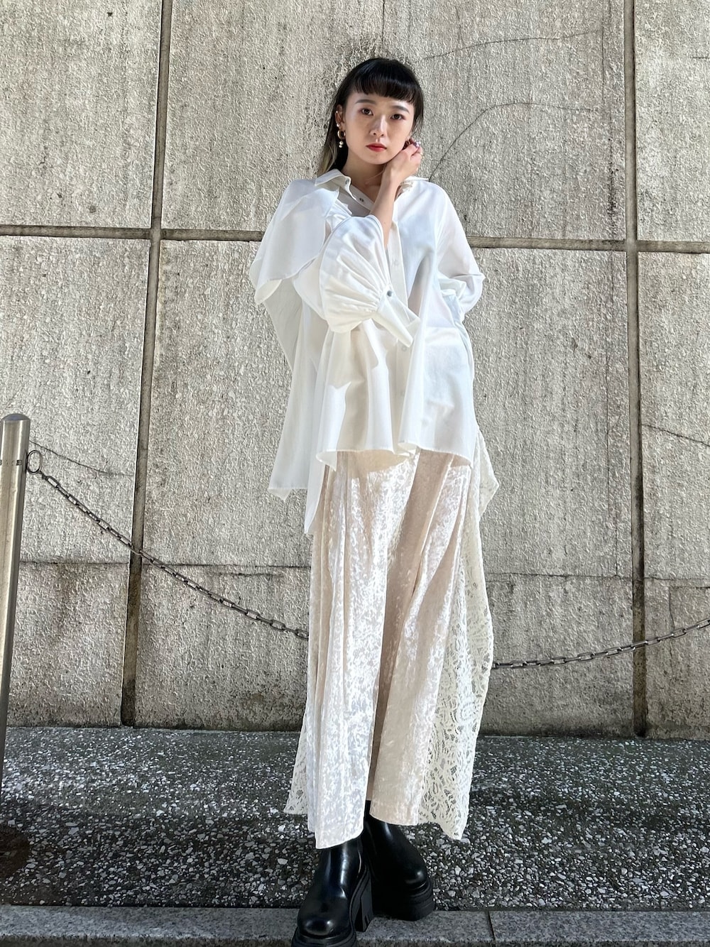 冬のホワイトコーデ!透け感が気になる方はカラー物のタートル等レイヤードしても可愛いと思います!このシャツはボタンではなくスナップなのが可愛いポイントです!