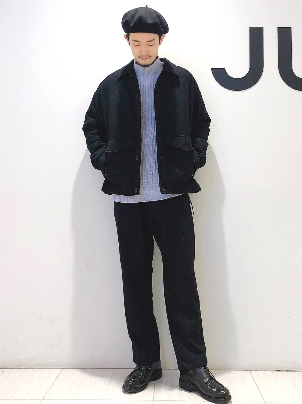 グラミチ別注のセットアップをシャープなブラックでセレクト インナーには淡いカラーリングのニットをインし、クリーンな印象に