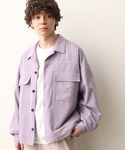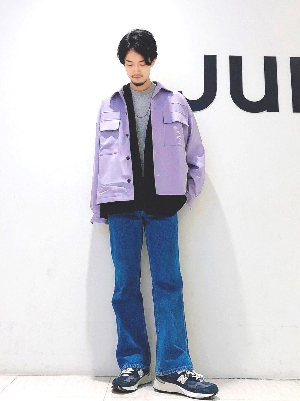 爽やかなラベンダーカラーを主役にしたレイヤードスタイル 着丈の異なるシャツブルゾンを重ね、前開けで動きを出しました フレアデニムにボリュームスニーカーを合わせ、足元にボリューム感をプラス