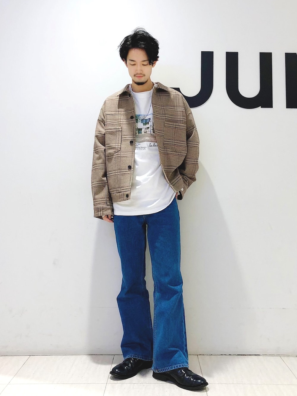 ご好評頂いておりますDAIKI NAKAMURAコラボシリーズからクールなグラフィックロンTをご用意 チェック柄のトラッカーブルゾンと合わせ、少し大人なストリートMIXスタイルに 足元はフレアパンツとレザーシューズでシャープに纏めました