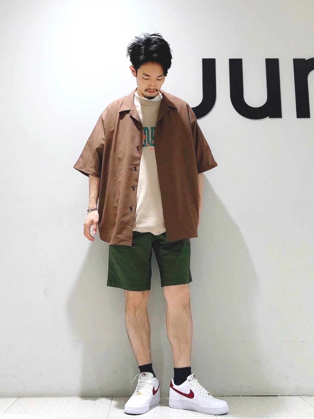 ショーツにビックシャツ、ボリュームスニーカーを合わせた夏のストリートMIXスタイル 男性らしいカラーリングを組み合わせ、アクティブな雰囲気に