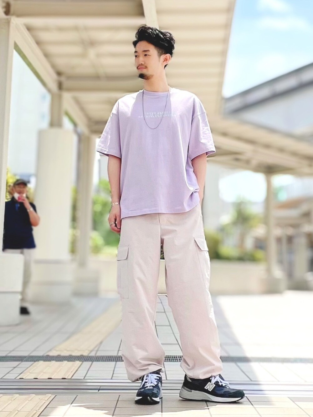 夏らしいラベンダーカラーのトップスにトレンドのミリタリーパンツを合わせました 全体的にスッキリしたカラーで合わせることでコーディネートが新鮮な雰囲気になります!