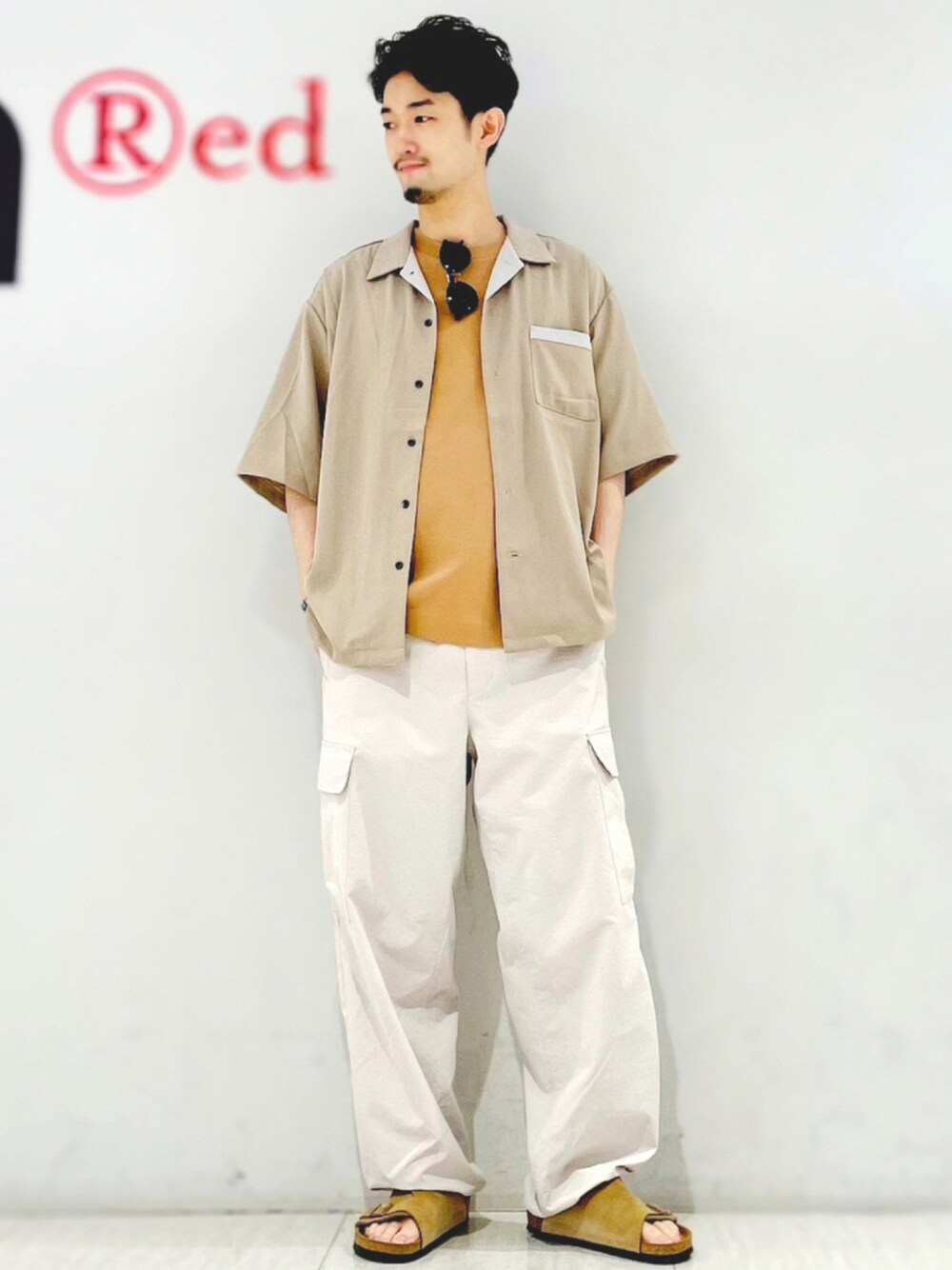 ベージュ×ホワイトでクリーンで男性らしいスタイリング 柔らかめのオフホワイトのカラーがベージュに自然に馴染み、爽やかさをプラス ベージュカラーが夏らしい表情に