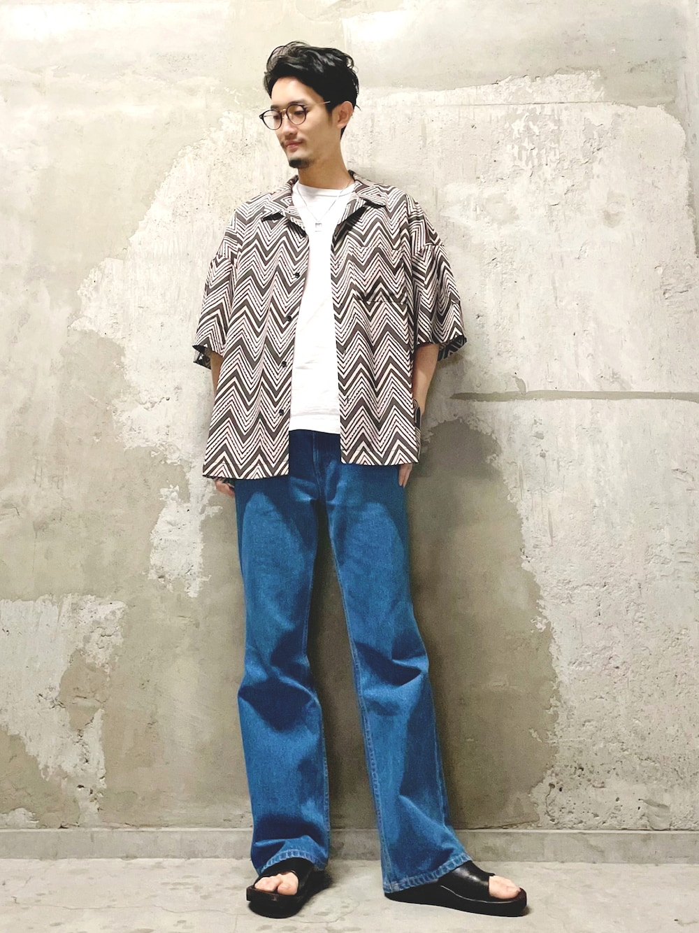 柄シャツ×デニム カジュアルな大人の夏スタイル 足元はレザーサンダルを合わせてリゾート感をプラス