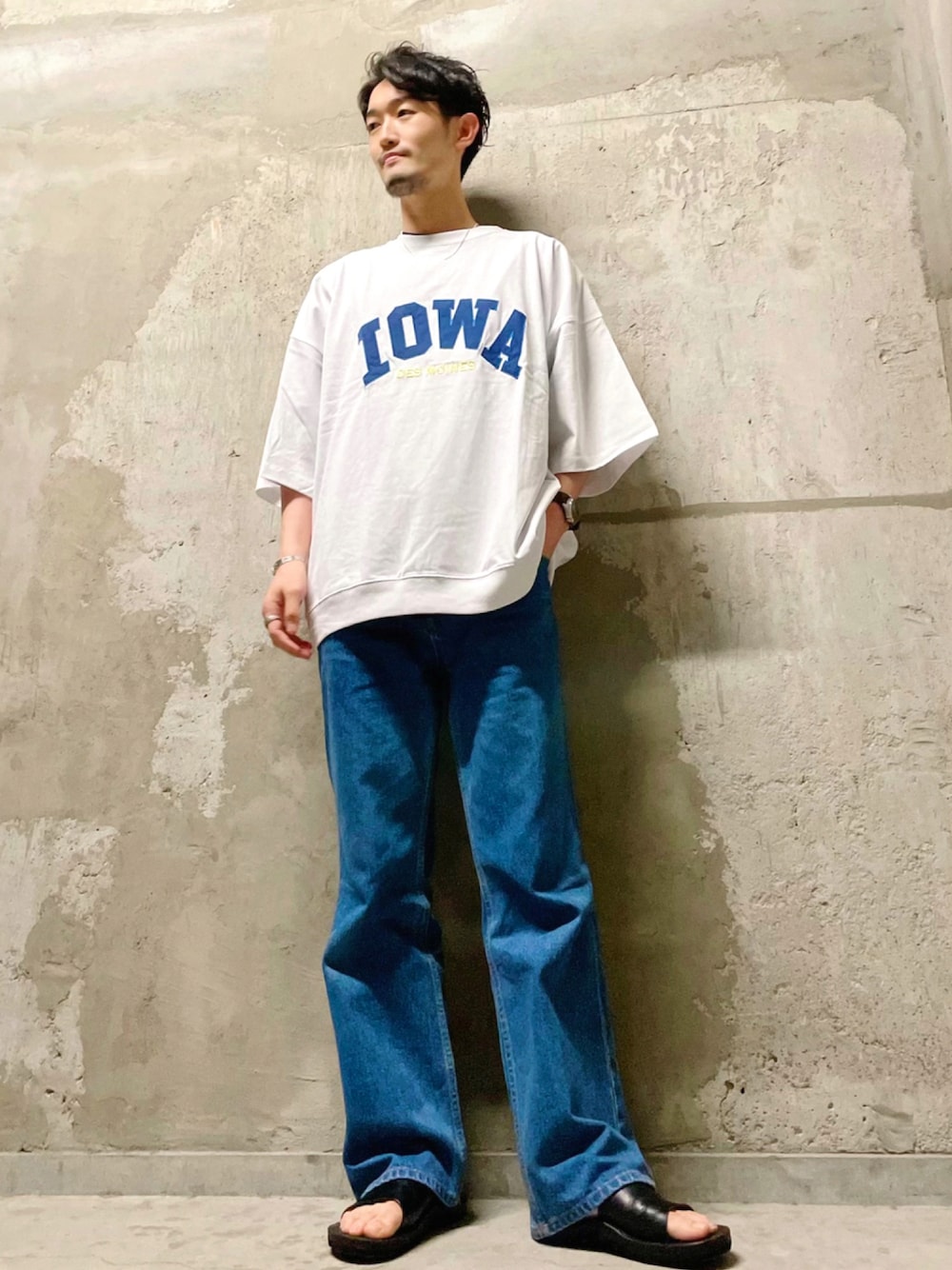 ビックT×デニムでつくる夏のカジュアルスタイル 大きめのカレッジロゴが夏のシンプルなスタイリングに映えます 足元はレザーサンダルで合わせ、大人の小慣れ感をプラス