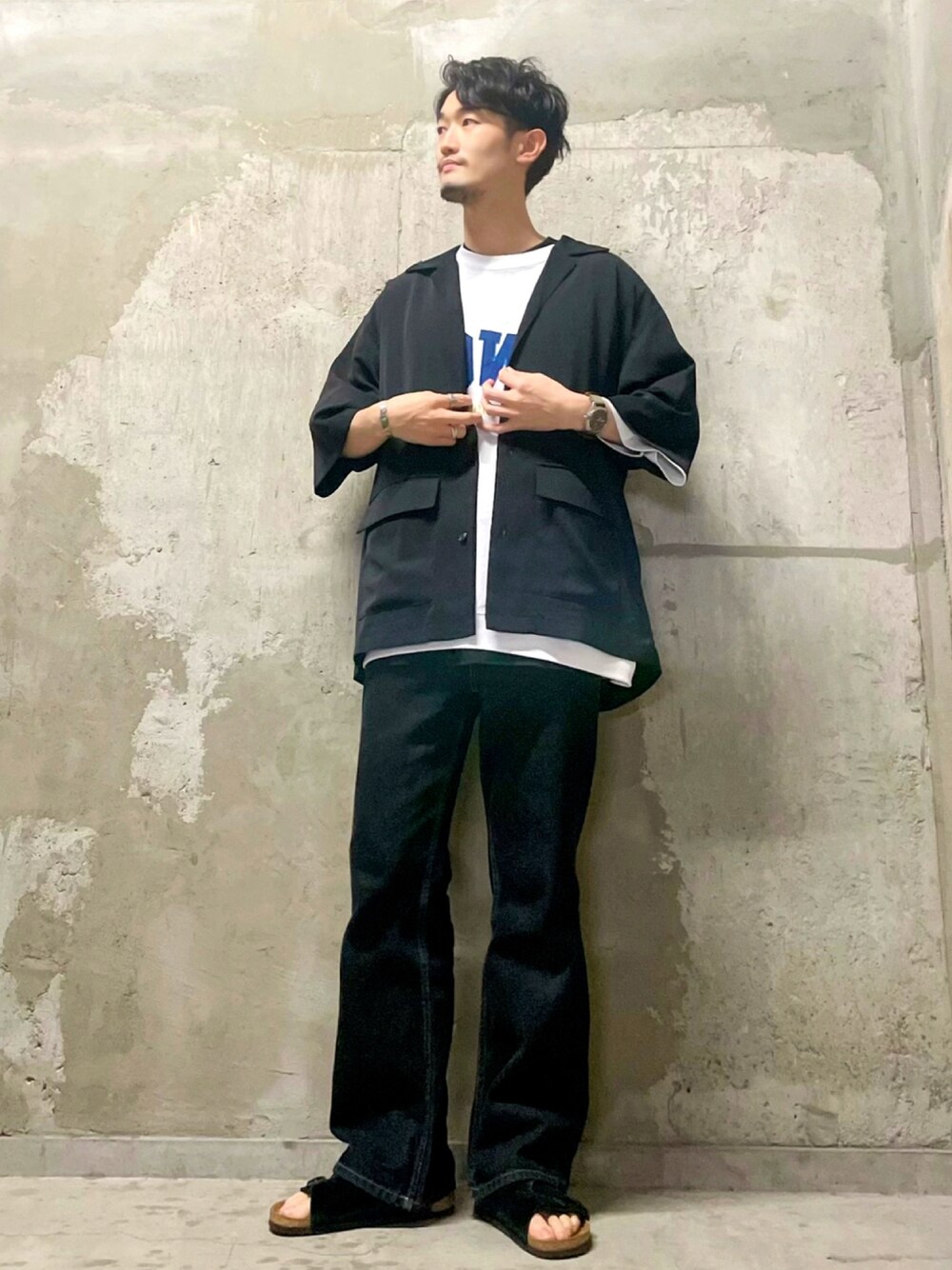 モノトーンをカレッジロゴで外した大人のストリートMIXスタイル 足元はセミフレアとサンダルでこなれ感をプラス