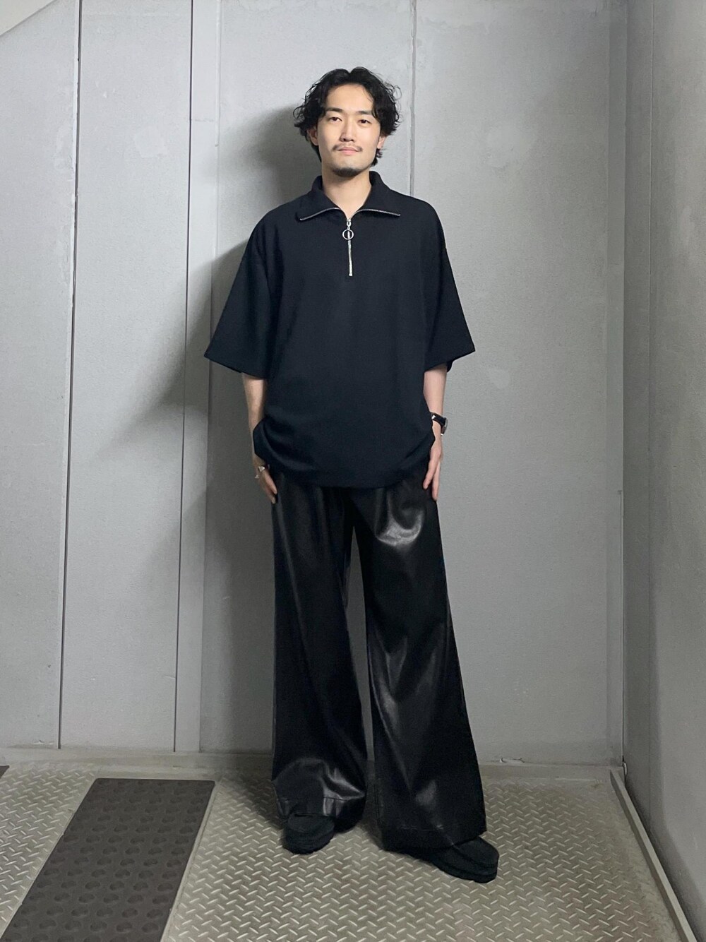 (着用画像の色味が変わって見えることがございます。アイテムページでのカラーの見え方が1番近いのでチェックされてください。) (個人的なアイテムの着用感想を記載しております。アイテムの詳しいサイズ感、生地感等もアイテムページにてご確認ください。) ●スタッフ情報● 大きさの参考にご利用下さい。 身長 174cm 体重 69kg ウエスト 72cm ---------------------------- ハーフジップのプルオーバーにレザーパンツを合わせたカジュアルスタイル 素材感やカラーでシンプルながこなれ感をプラス カラーもオールブラックでまとめクールな雰囲気に