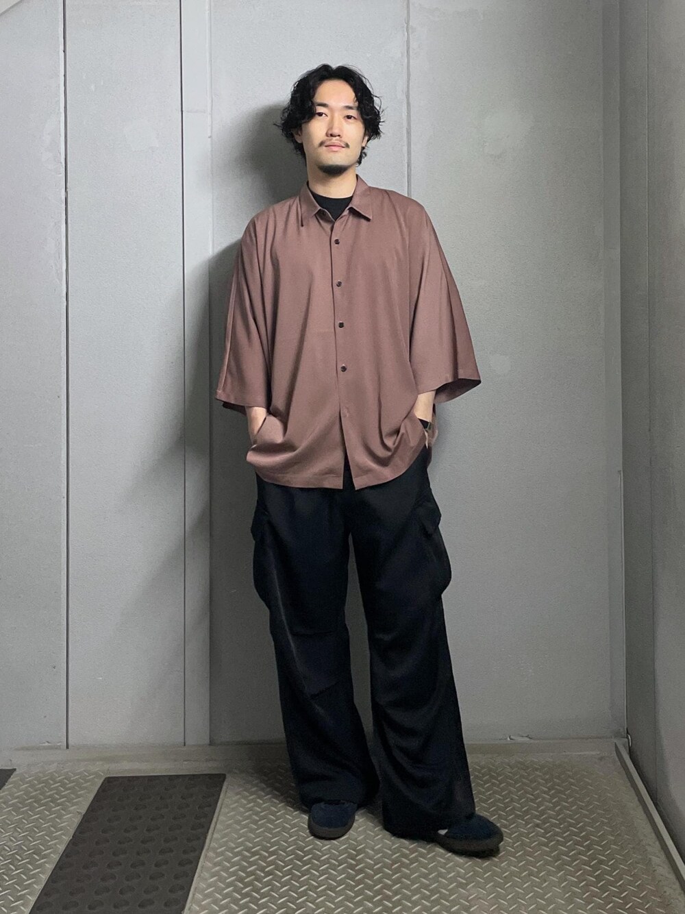 とろみ感のあるオーバーサイズのシャツにパラシュートパンツを合わせたモードなスタイリング シャツのカラーで新しい雰囲気に