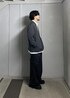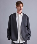 クリーンなノーカラージャケットにモードな印象のミリタリーパンツを合わせた少し大人なカジュアルスタイル カラーはモノトーンで合わせ、秋口にぴったりな落ち着いた印象に