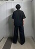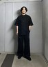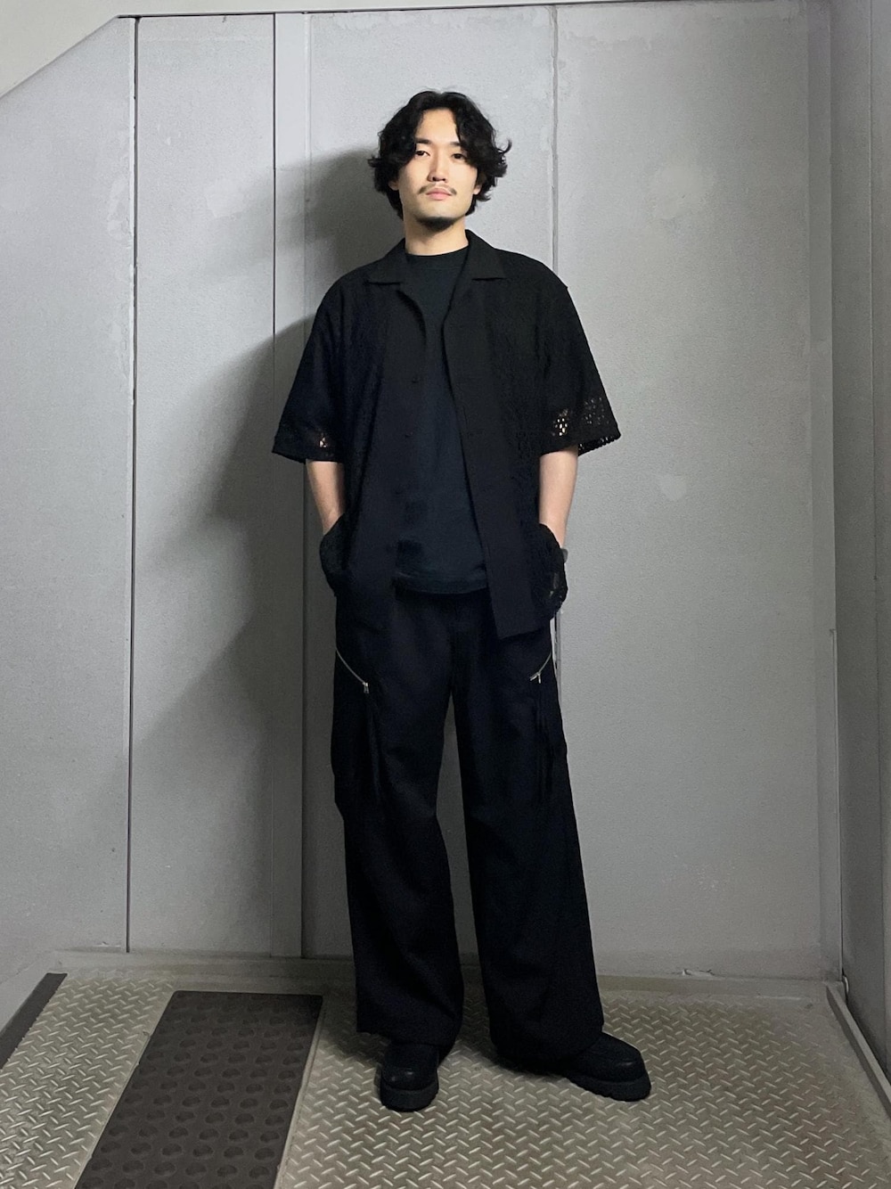 レースのシアーシャツとミリタリーパンツで少しモードなカジュアルスタイルに カラーもモノトーンでまとめよりクールな雰囲気をプラス