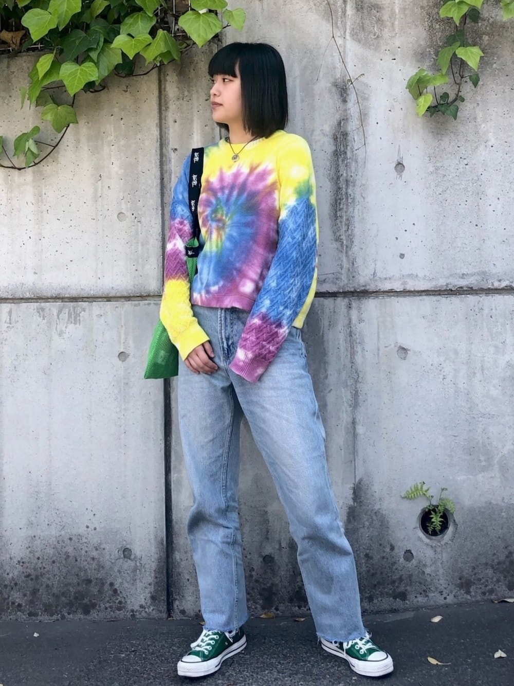 タイダイのサマーニットで 今の季節にピッタリなコーディネート🍀 派手なニットにはカジュアルな ハイウエストボーイズデニムを合わせ ルーズな着こなしに❕👣 バッグとスニーカーの色味を合わせ 統一感を出してみました。 🧸instagram @___moeeeee ご覧頂き有難う御座います🙇♀️