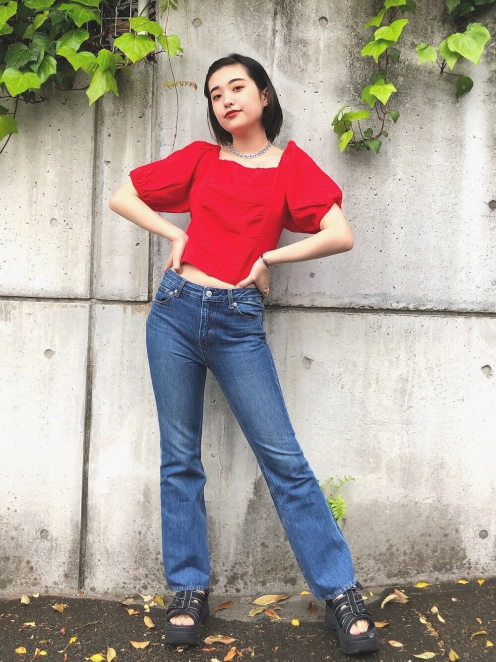 印象的な赤のブラウスの コーディネート❤️❤️ 襟元がスクエア型になっていて デコルテがとっても綺麗に見える✨ フレアパンツと厚底サンダルと 合わせてみました!! 🧸instagram @___moeeeee ご覧頂き有難う御座います🙇♀️