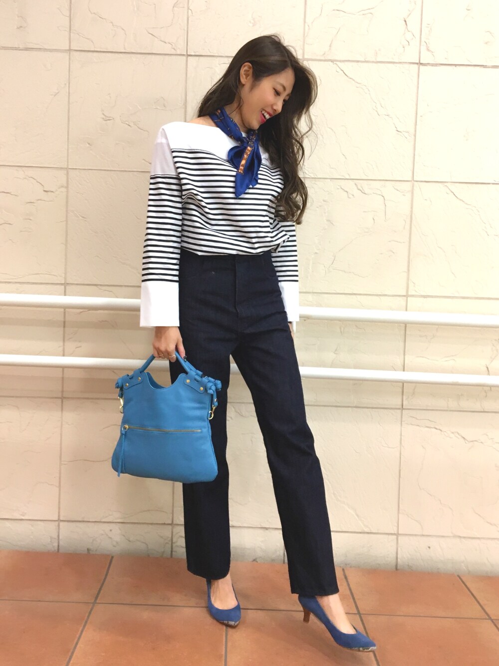 春らしいマリンスタイルです。 ハイウェストのデニムで脚長効果も◎