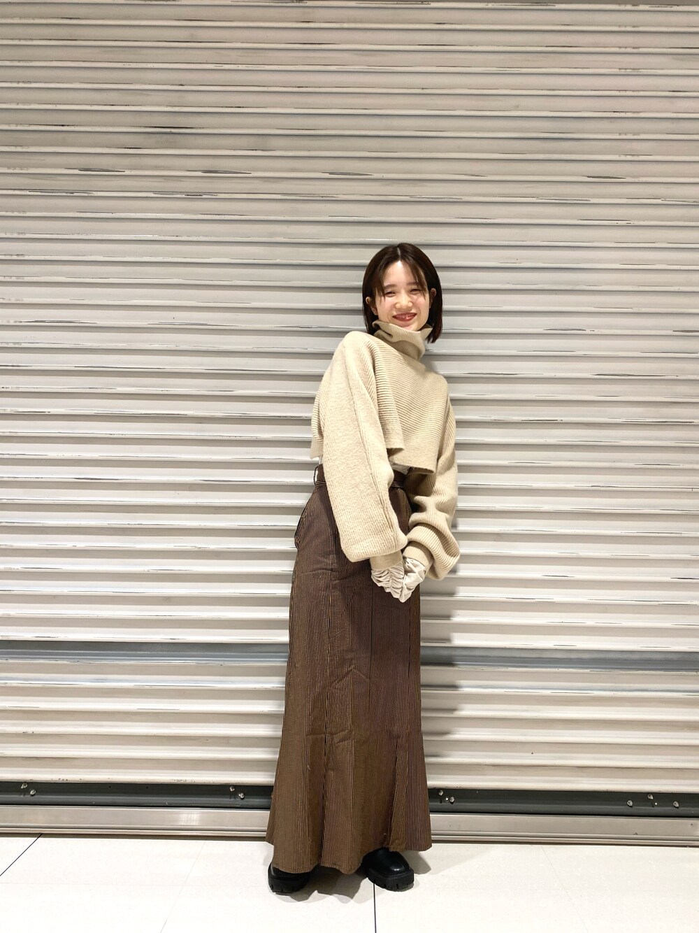 okazaki risa(Kastane 金沢フォーラス店)のニット/セーター「【新色追加】ハイネッククロップドニット×BIGシャツSET」を使ったコーディネート