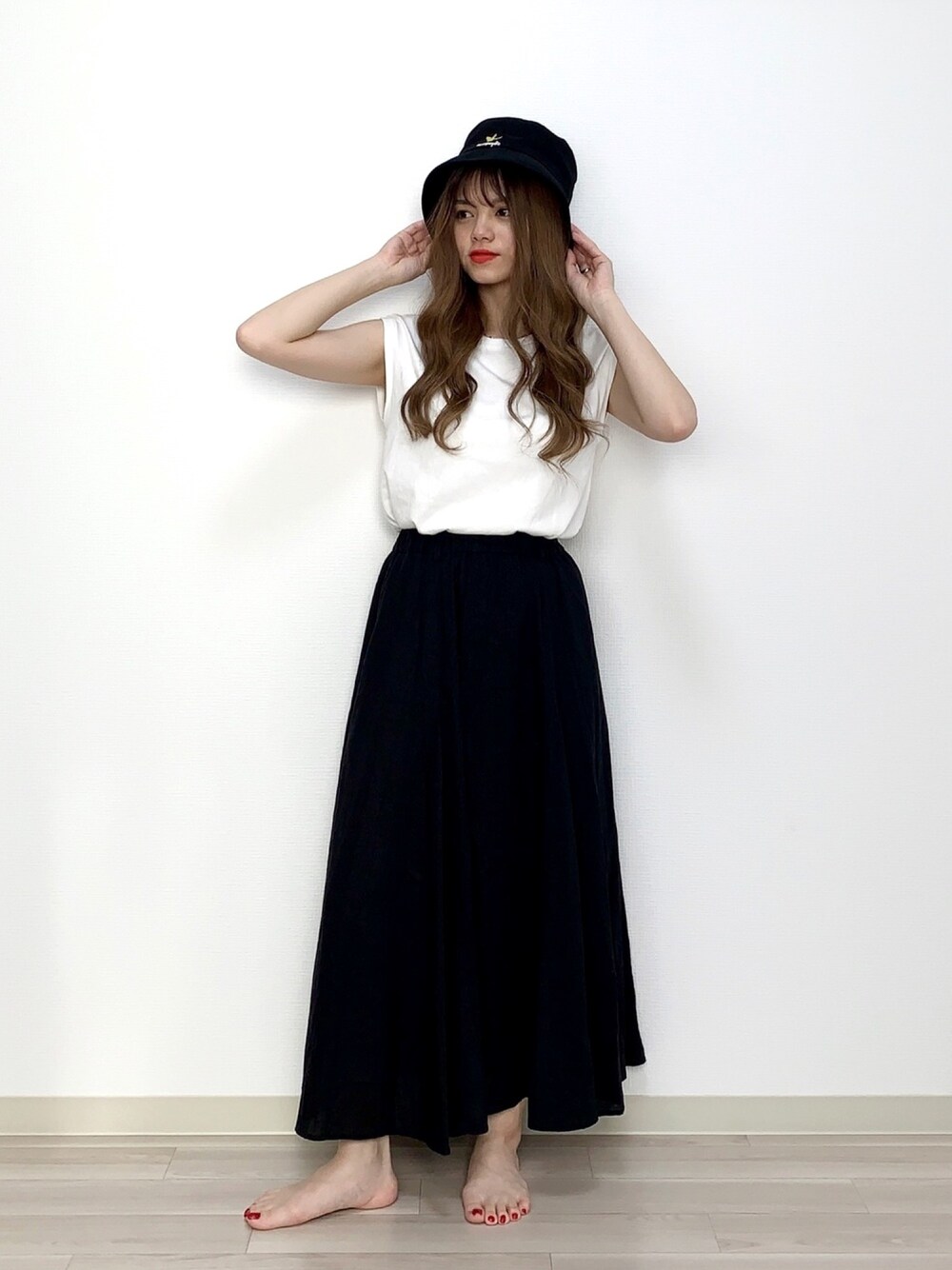 マークゴンザレスのハットを ポイントにするために トップスとスカートは あえてシンプルな形とカラーを チョイス◎ カジュアルダウンしすぎないように ノースリーブのトップスを使い、 女性らしい印象を残して合わせました♩
