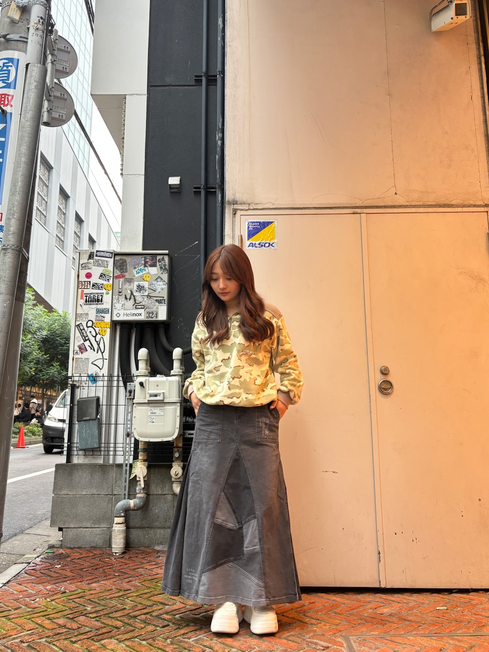 Momo(AVIREX 新宿店)のデニムスカート「REMAKE STERETCH DENIM SIDE FLARE SKIRT/ リメイクストレッチ デニムサイドフレアースカート」を使ったコーディネート