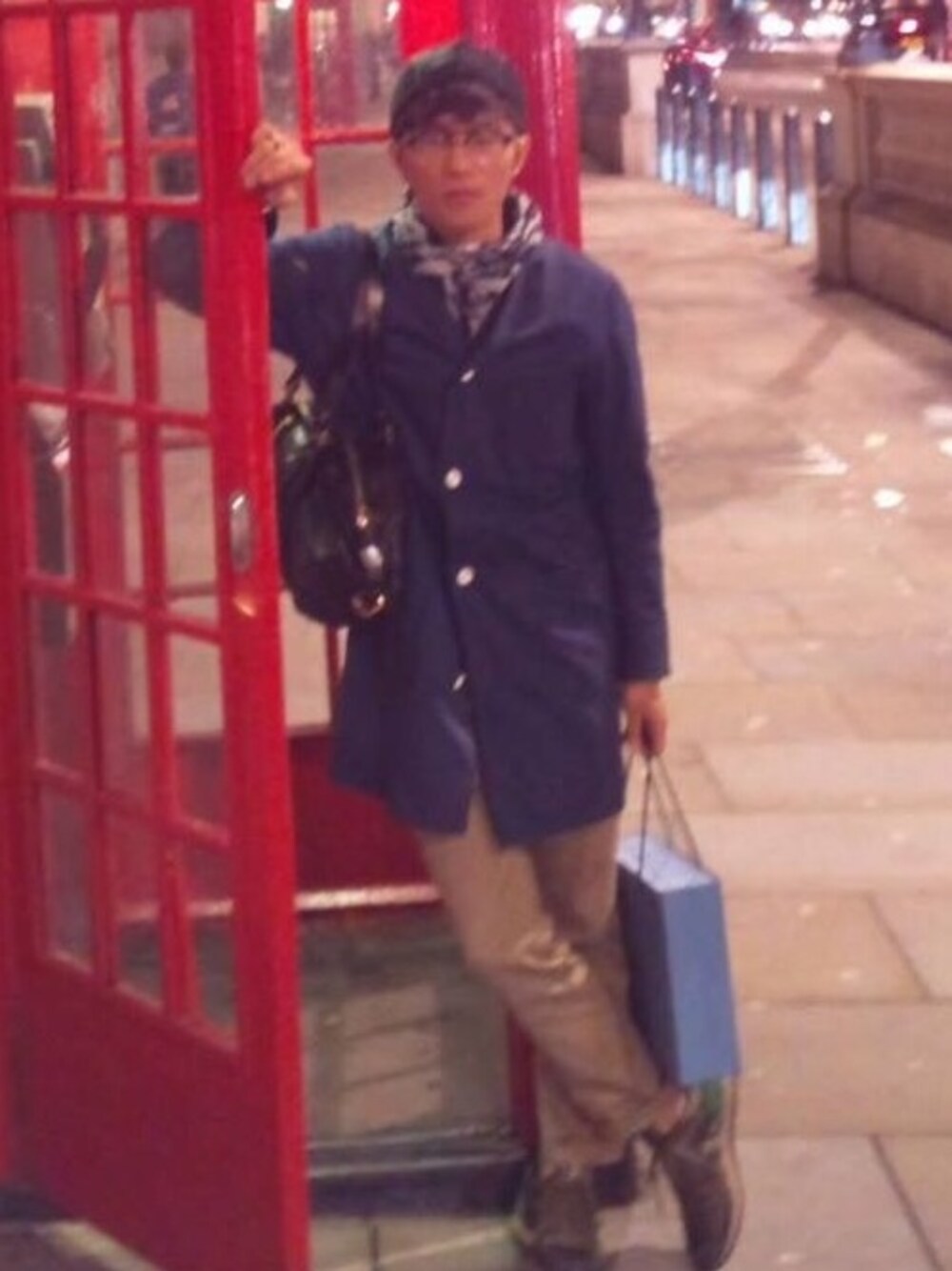 糸が細くて滑らかな生地感のチノパン、丈はくるぶし下より気持ち短め、そのきれいめチノパンに形の綺麗な少し鮮やかな紺ショップコートを合わせて、同系色のカモフラのコットンスカーフはいやらしさがない程度の靴との対比