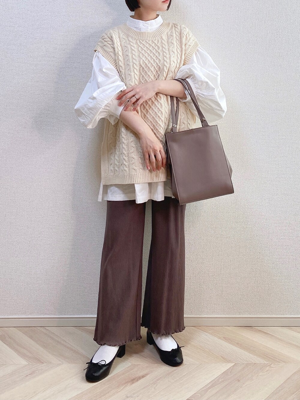 a o i *のベスト「ケーブル編みニットベスト」を使ったコーディネート