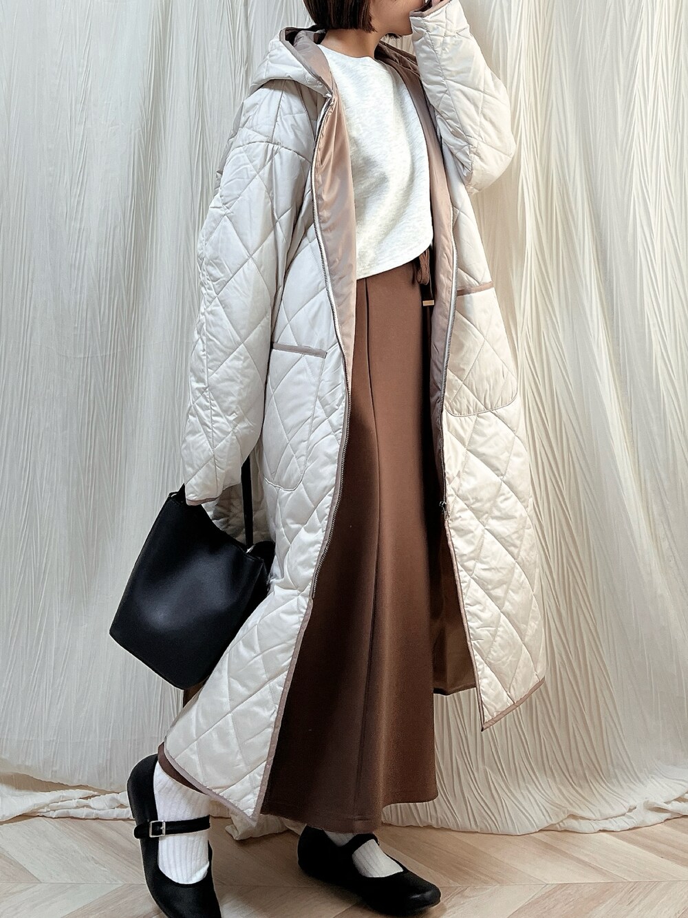 a o i *のダウンジャケット/コート「キルティングフーディロングコート」を使ったコーディネート