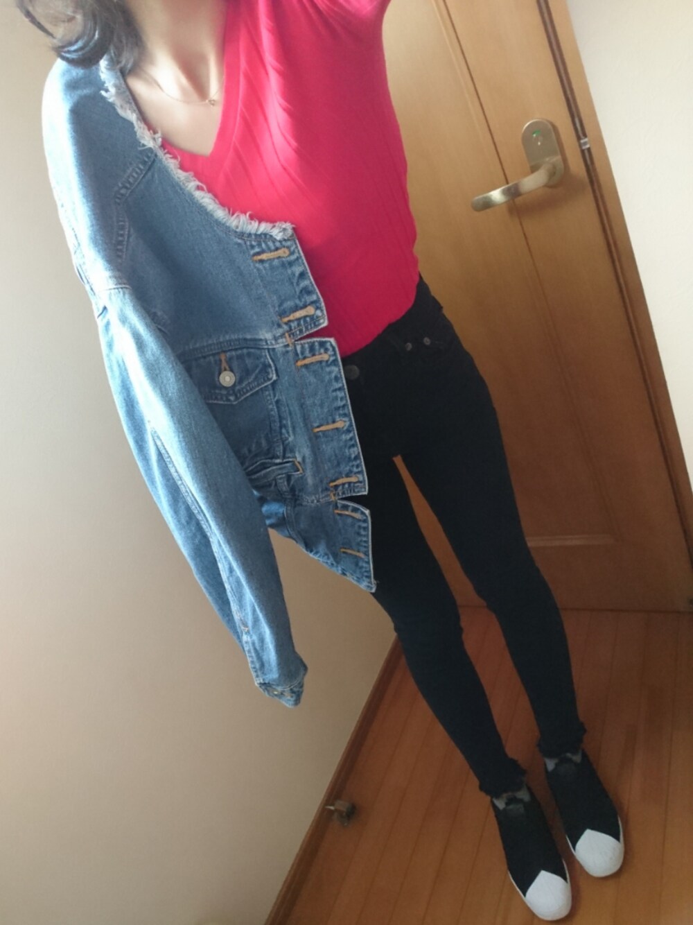 通勤コーデ。 ピタピタで、デニジャケでゆるっと← アディダスのスリッポンが楽チンすぎて ダイアナより使ってる🙆