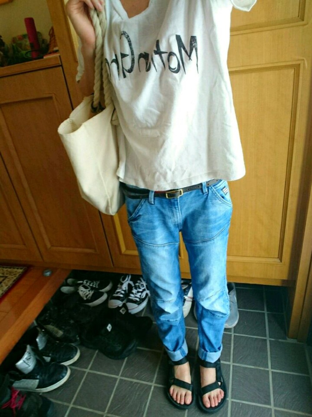 通勤コーデ。 着替えるのがめんどうなので 通勤はいつもシンプルww トップスはRight-onで購入した昔のもの。 2日に1回はtevaです(笑)