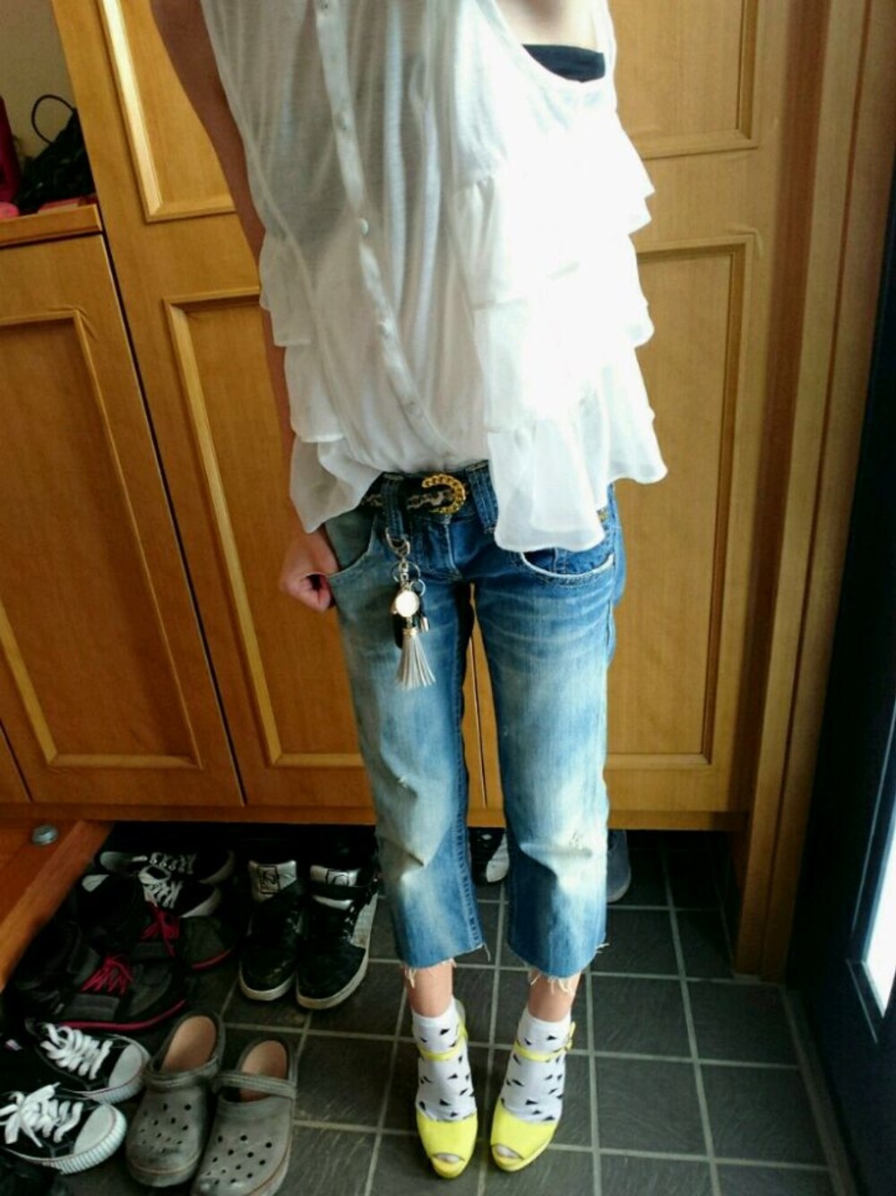 おでかけ。 着回してるだけw 靴下×サンダル style☆ 歩き回るにはしんどい高さなので はける日が限られる(笑) ベルトで少し秋仕様に近づけてみたw が、まだまだ夏ですね👻