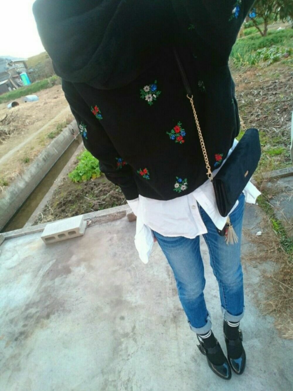 おでかけ。 靴下×パンプス☆ デニムを折り返して 見えるように。 花刺繍のスウェットに バックにデザイン性のあるシャツで合わせた 少し個性的なコーデ♪