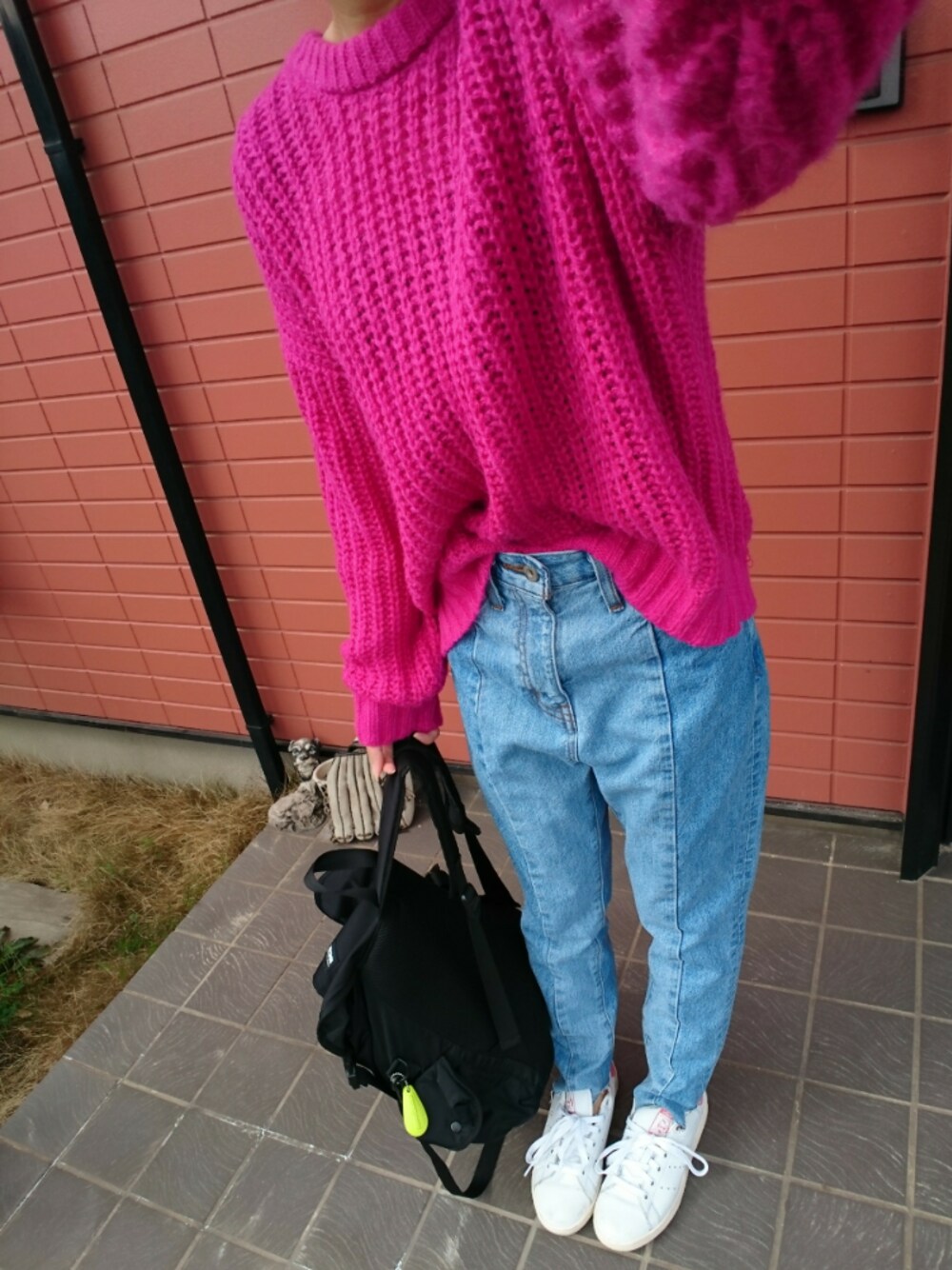 通勤コーデ。 暖かかったので pinkニット1枚で♪ デニムはお気に入りのTODAYFULの新作♥️