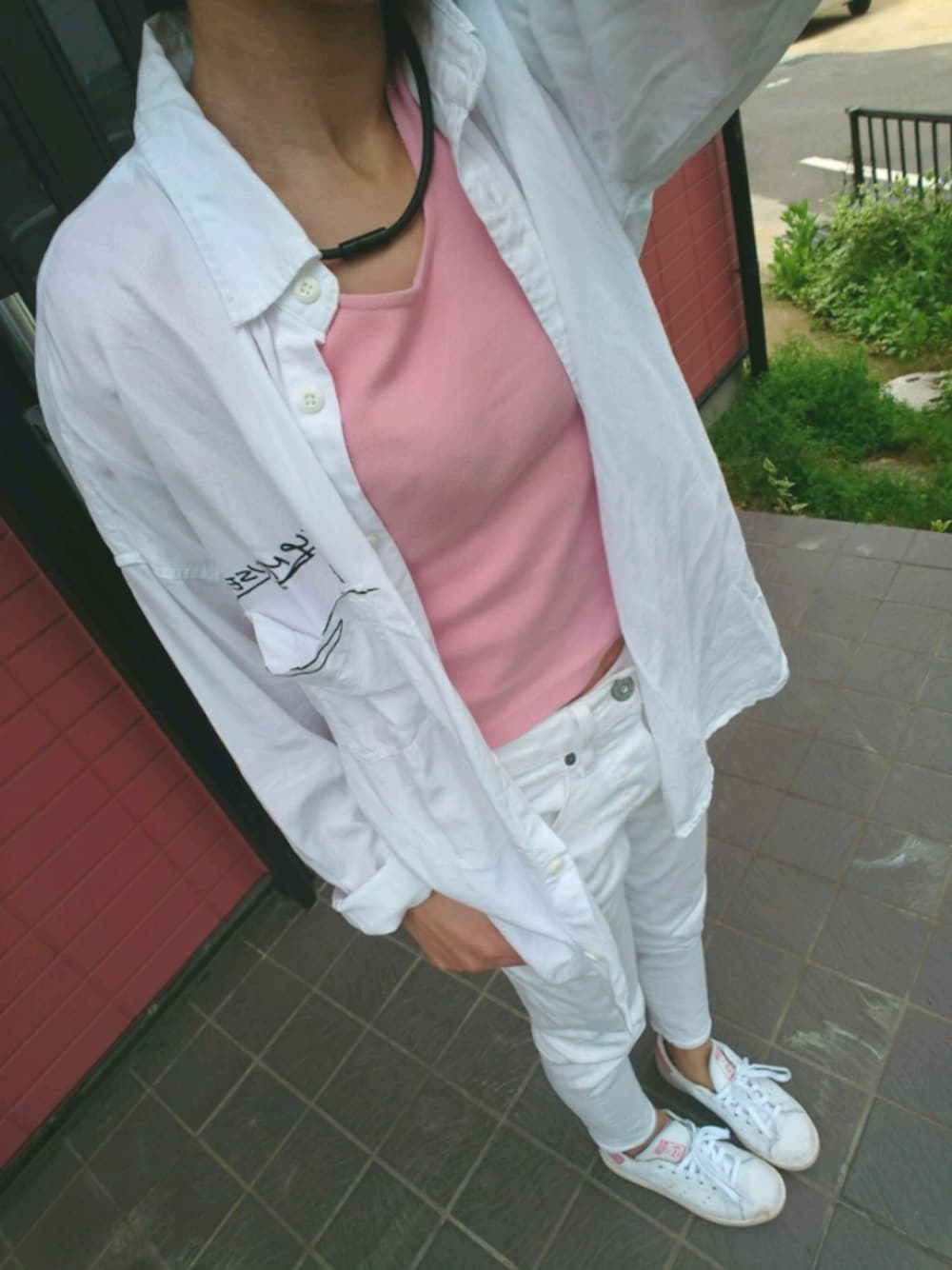 通勤コーデ。 ホワイト×ピンク💕 バックがミッキープリントのやつ💋 スタンのピンクとリンクさせて 中のトップスもピンク♪