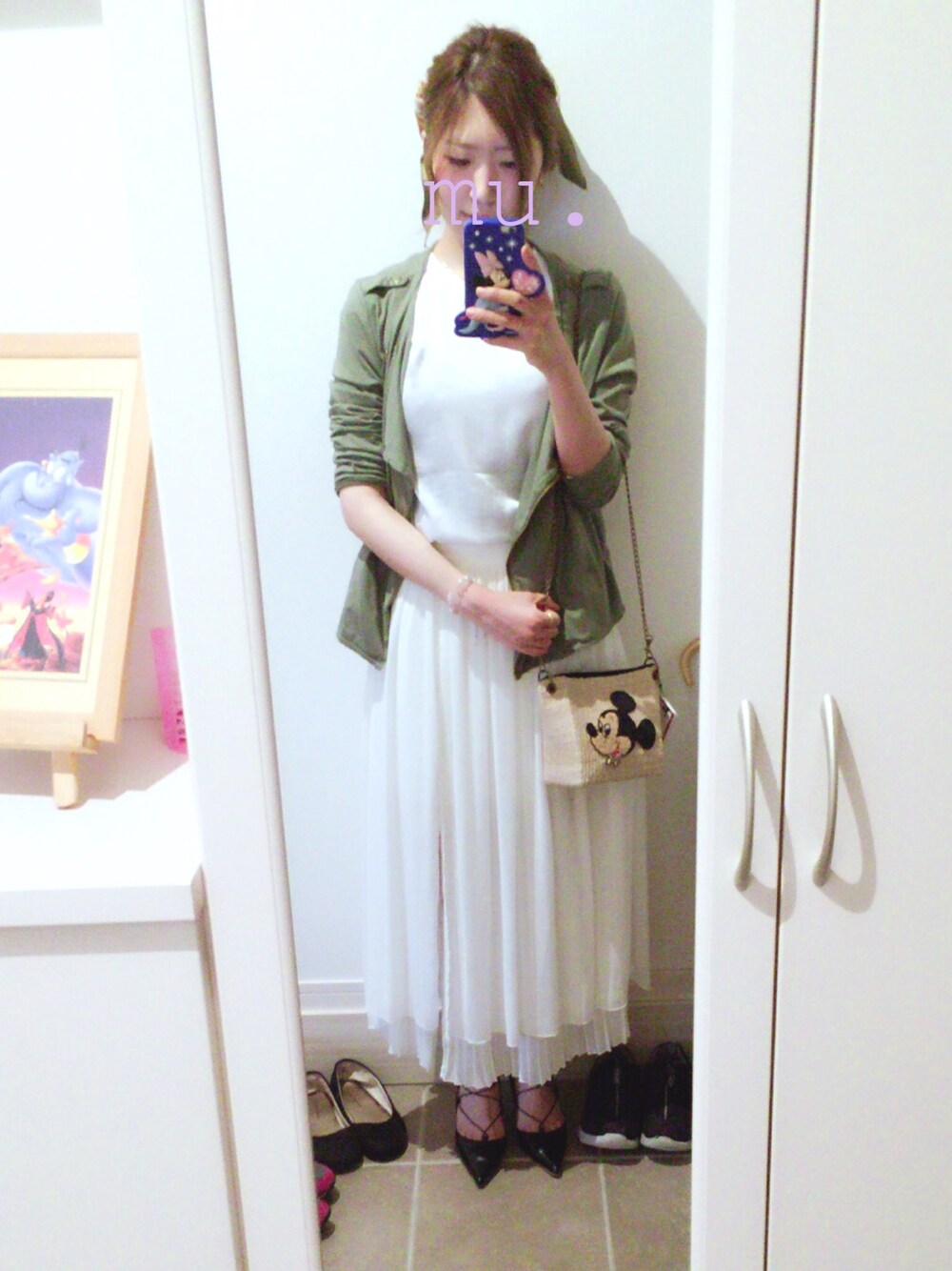いつもいいね、save、フォロー ありがとうございます💕 今日は天気も悪くて少し 肌寒いので上に羽織りました☺️ シフォンのスカートはスリットが 入っててすっごくお気に入りです☺️💕 柄が何もないのでカバンをミッキーに💕 そして頭にはまたまたスカーフ✨ 今回はカーキで合わせました😊