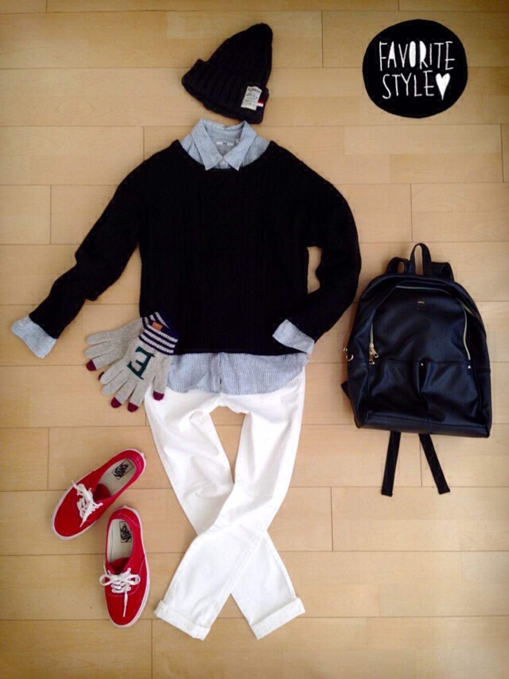 ブラック系のニット/セーター、レッド系のスニーカー、その他の手袋を着用したレディースの冬コーディネートの1枚目の写真