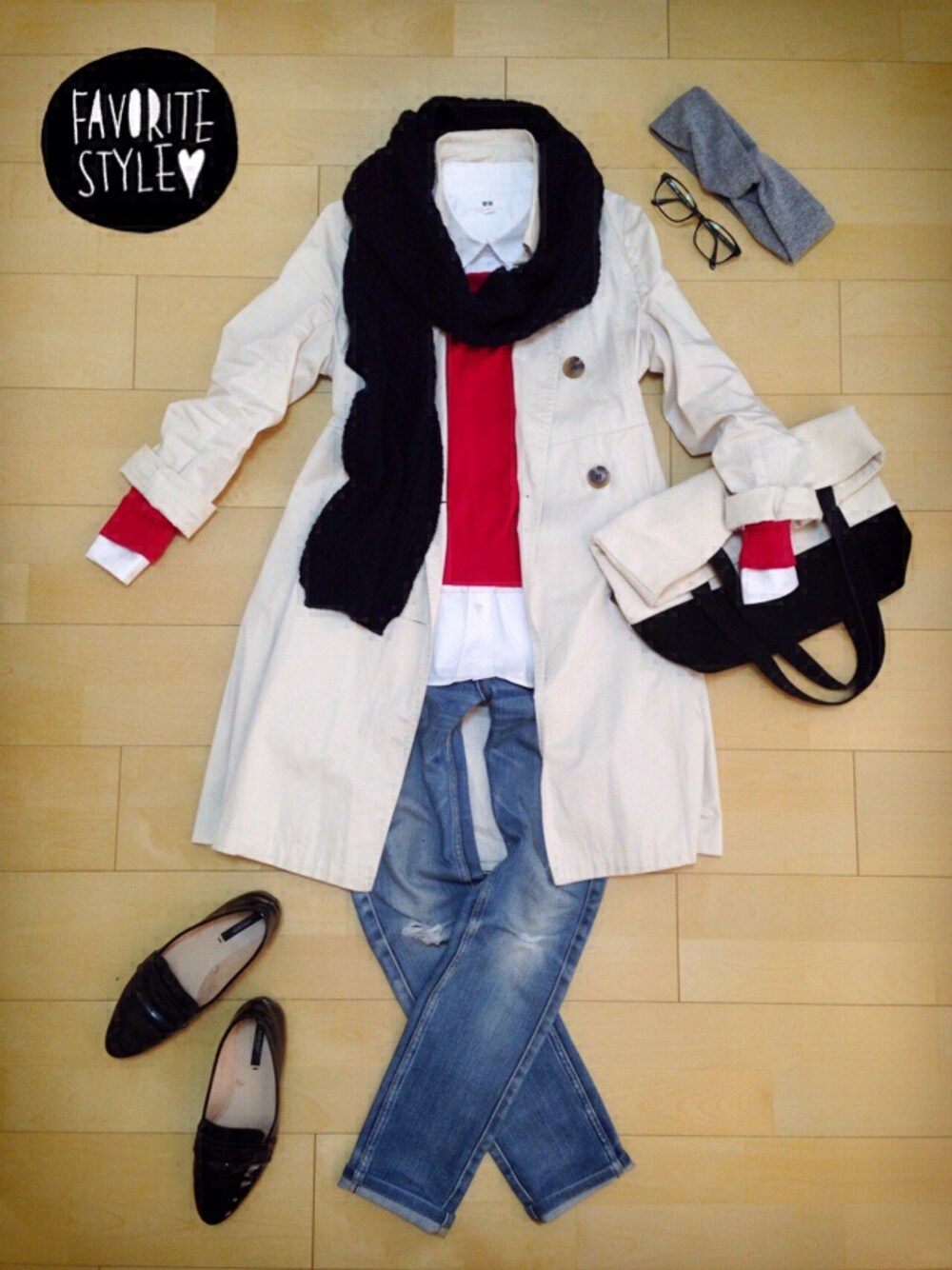 トレンチに赤ニットは間違いなし(b3`*)♡ マフラーは黒に見えるけどネイビーです。 SAVE&FOLLOW&いいね!ありがとうございます(͒⑅′࿉‵⑅)͒ෆ*