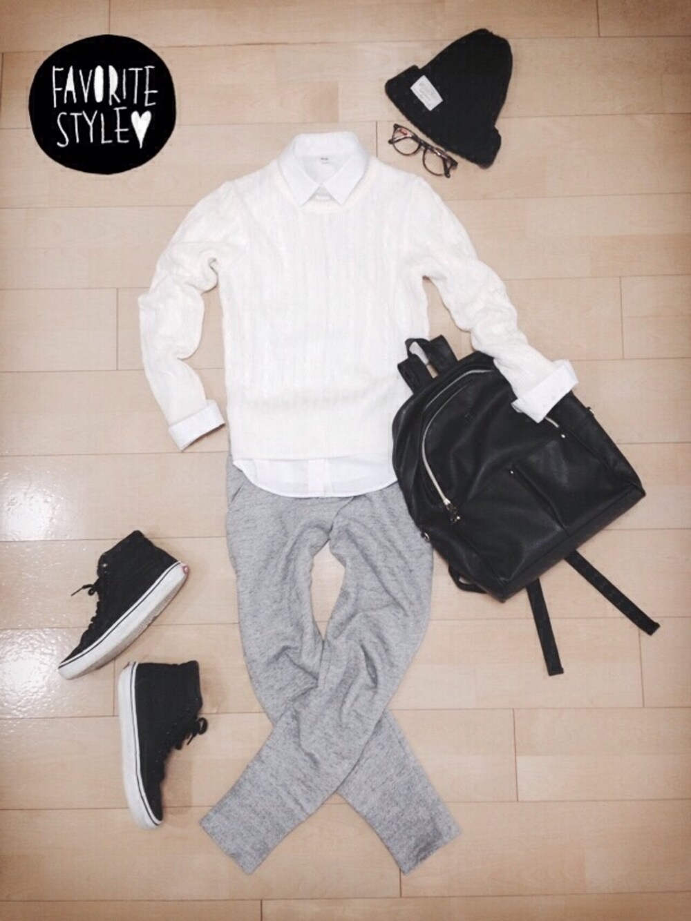 ブラック系のスニーカー、グレー系のその他パンツを着用したレディースの冬コーディネートの1枚目の写真
