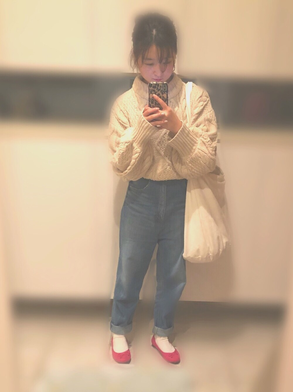 差し色のピンクのバレエシューズ が、めっちゃかわいい! ケーブルニットもデニムの形も かわいくって…、 今日もかわいい!!