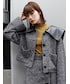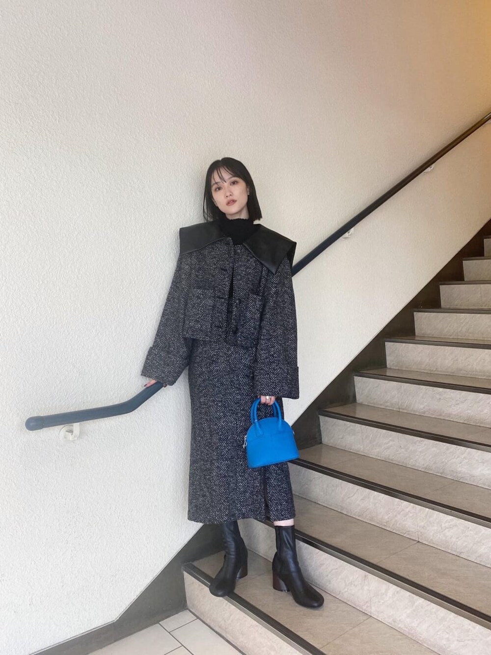 【BIGカラーが目を引く今季トレンドアイテム!】フェイクレザーの大きめの襟が今年らしく、MURUAらしいモードな印象に。ヘリンボーン素材なので高級感も出ます。共地のスカート合わせでセットアップで着るのも、デニムなどカジュアルに合わせるのも、ワンピース合わせも可能です。存在感のあるアイテムなのでシューズはコンパクトなブーツをチョイスしました。オールブラックでまとめ小物に差し色のブルーを加えてアクセントに。