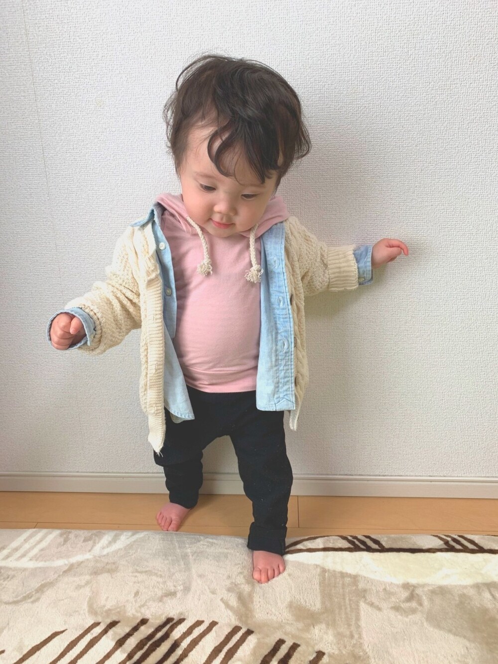 色的に春コーデになってしまった(笑) 薄ピンク好きやし こういう色にデニシャツ合わしたら 可愛いなあとおもい、 それでも寒いからニット羽織らせたら 可愛い色合いに(笑) パーカーも上のニットも 韓国子供服⌣̈⃝ ♡ ⌣̈⃝ ♡ お腹のでぐあいはスルーして下さい(笑)
