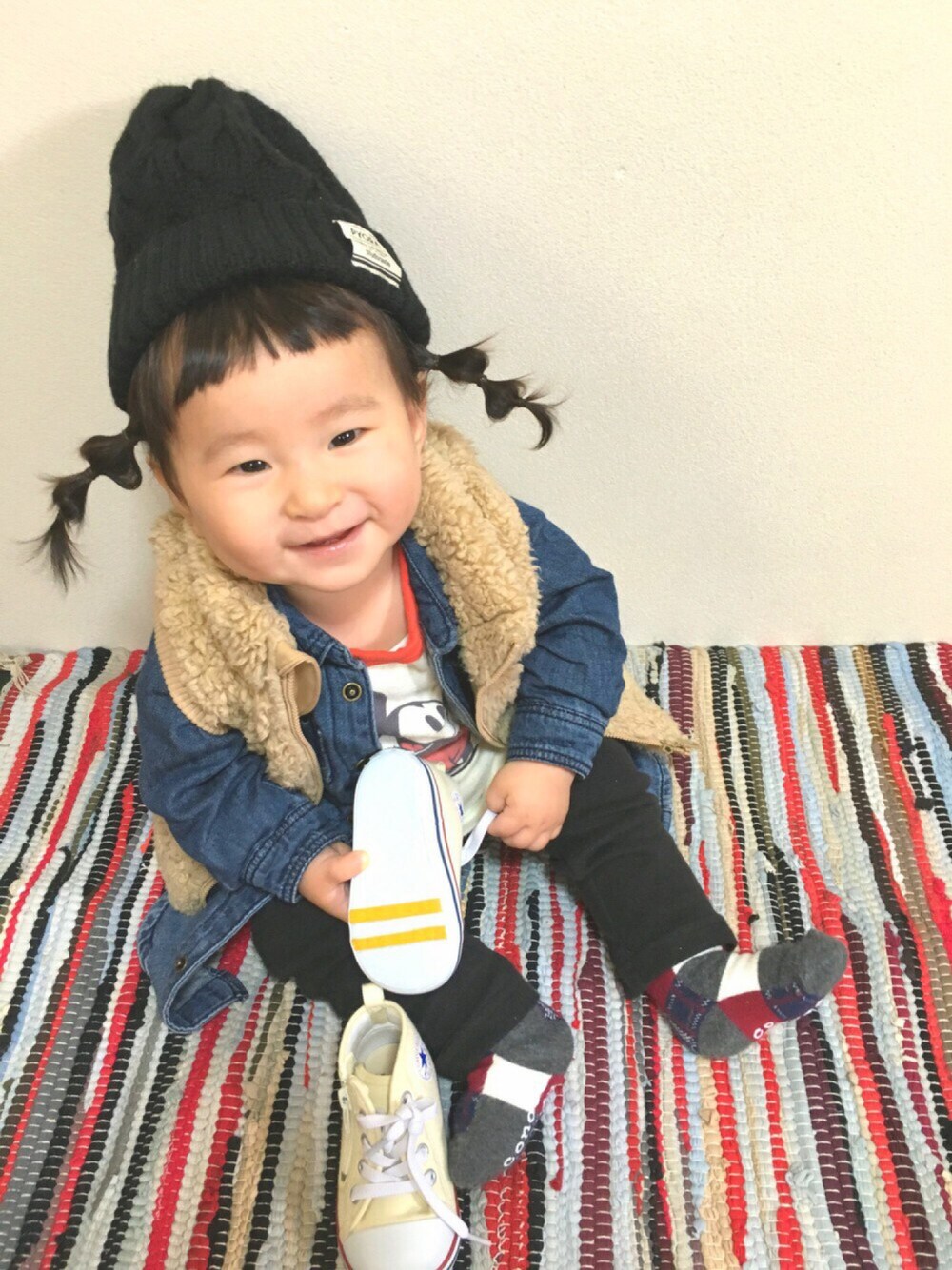 今日は祝日なのにパパは朝からお仕事😣 近くの公園で農業祭とかゆうのがやってるってひいおじいちゃんがゆってたから2人で行ってきた👯💕 今日は寒かったなぁー🙌 また靴は履いてくれへんし帽子もすぐ脱がれた👶💦しかも昨日と靴と帽子同じやん! 今日もカジュアル👶いもむしツインテール👯