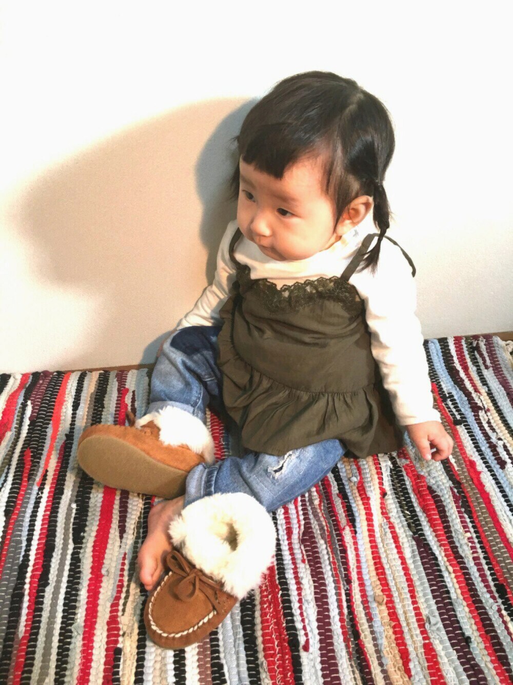 今日で10ヵ月になりました💓 赤ちゃんって1歳なるまでは赤ちゃん?👼 赤ちゃん感がほとんどない😳 今日は重ね着キャミにモカシンでちょっとお姉ちゃんっぽい☺️ 髪型は一応三つ編み👯 UNIQLOヒートテック昨日買ったのに今日は100円安くなってるらしい😭ショック😭