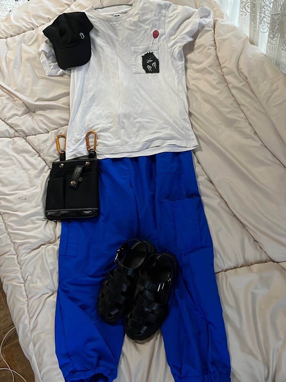ブルーのスポーティーパンツにシンプルなTシャツをあわせてみました