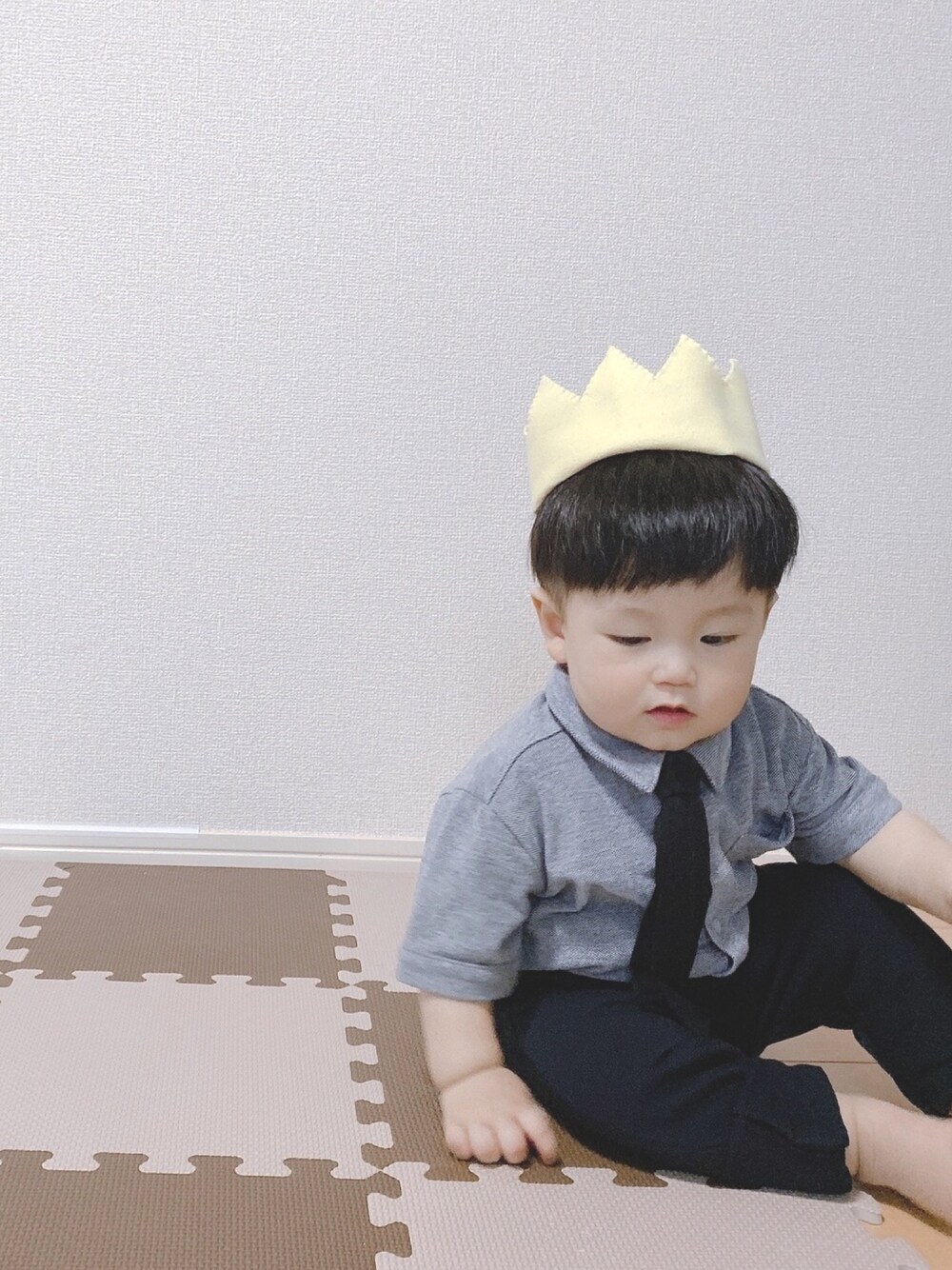 息子1歳のお誕生日の写真を 撮った時のお洋服︎☺︎ 前日に髪の毛切りすぎて 韓国人風になりました☁️