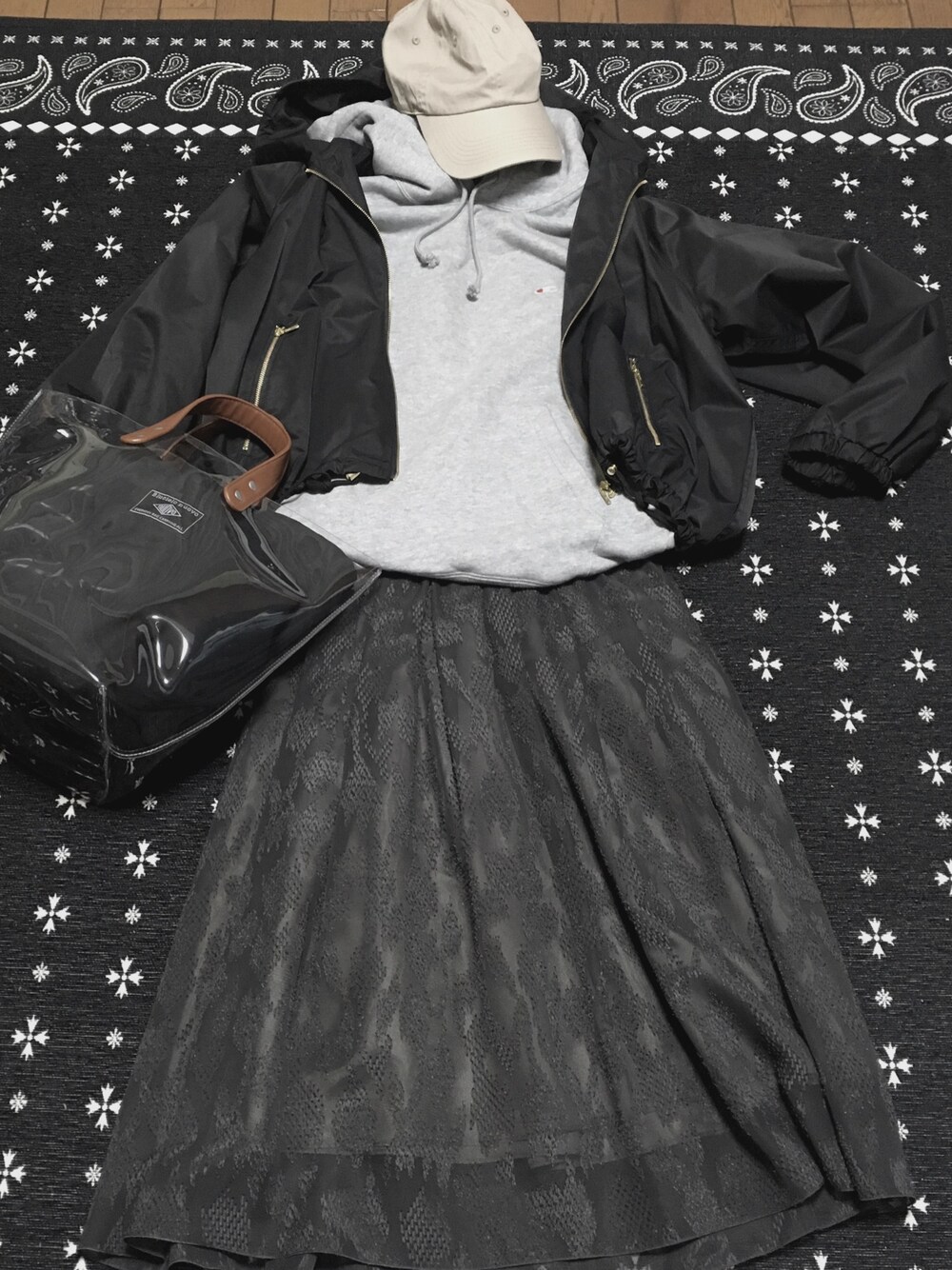 雨だったので動きやすく🚶♀️ マウンテンパーカーに、濡れても良いおNEWのビニールトートがポイント★