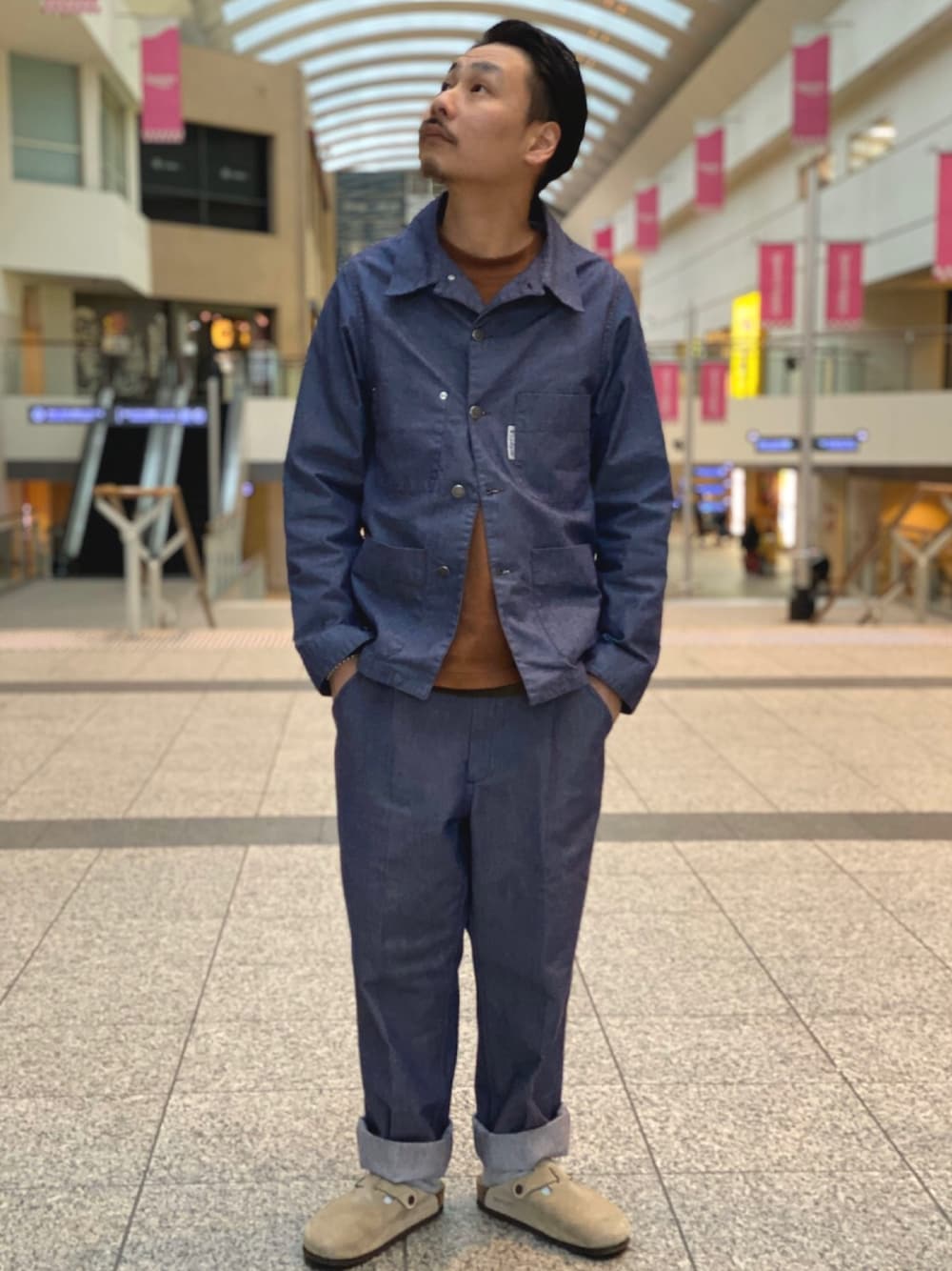 フレンチワークのセットアップ。 別のブランドですが同じ生地を使っていて、良い雰囲気だったのでセットアップになりました。 今日はビルケンシュトックのボストンを合わせてみました。